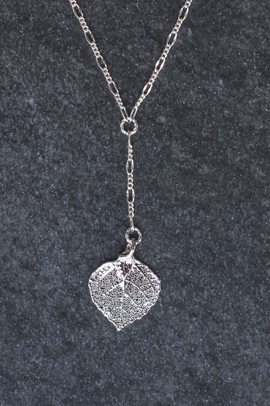 Classic silver chain creates this dramatic Y style necklace with a small Silver leaf