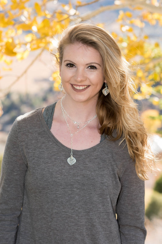 Classic silver chain creates this striking long necklace with a Silver leaf and crystal dangles