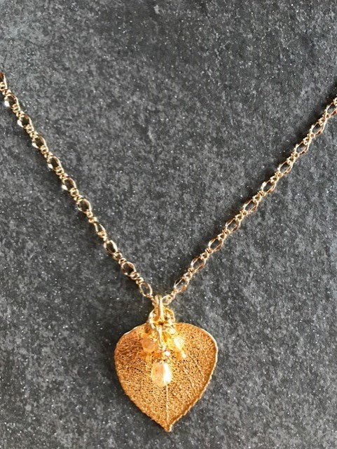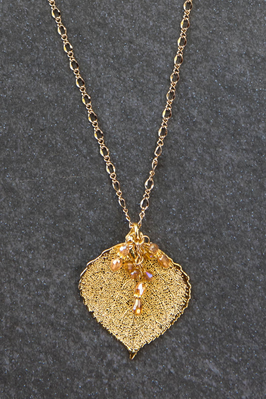 Classic gold chain creates this delicate style necklace with a small Gold leaf & crystal dangle