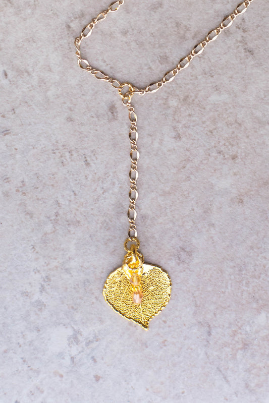 Classic Gold chain creates this dramatic Y style necklace with a small Gold leaf