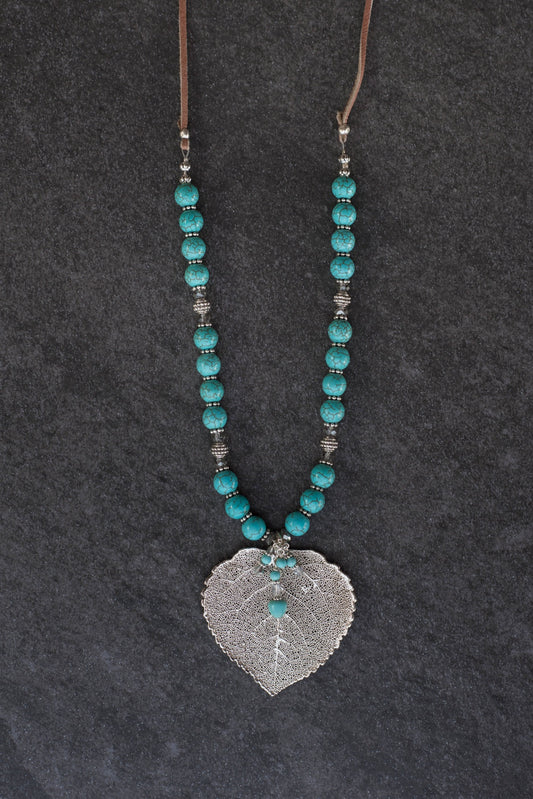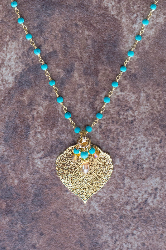 Gold leaf lariat, Turquoise & white Freshwater pearls