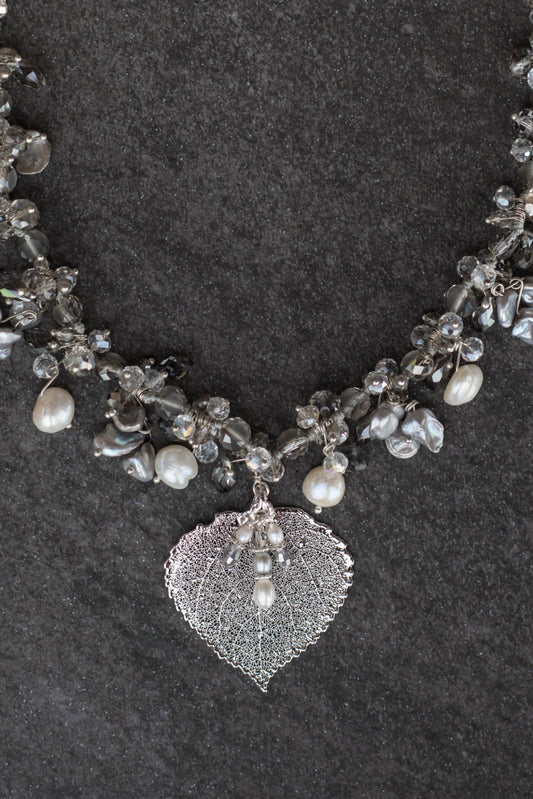 Elegant silver and white pearls are woven into this exquisite necklace with crystals and a silver Aspen leaf. A pearl & Chrystal dangle completes the piece
