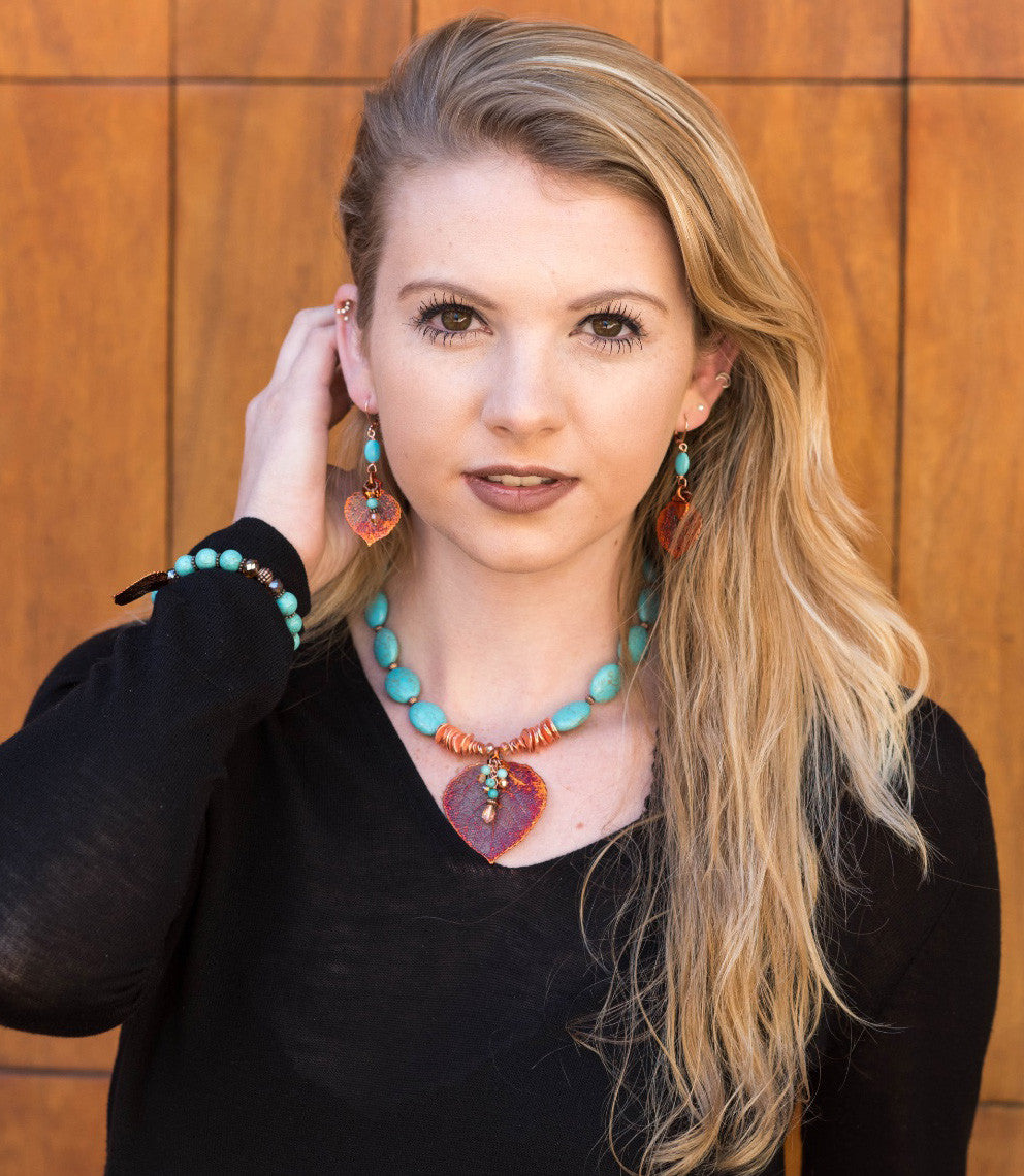 Copper leaf &Turquoise stretch bracelet embellished with Copper crystals.
