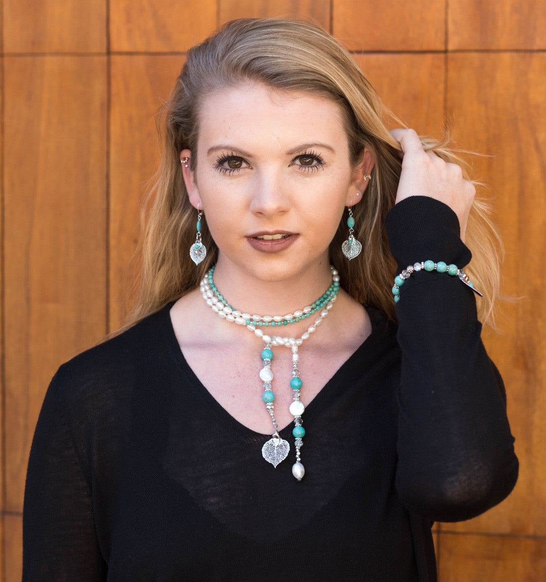 Gold leaf lariat created with Turquoise & white Freshwater pearls, gold crystals complete this versatile piece .