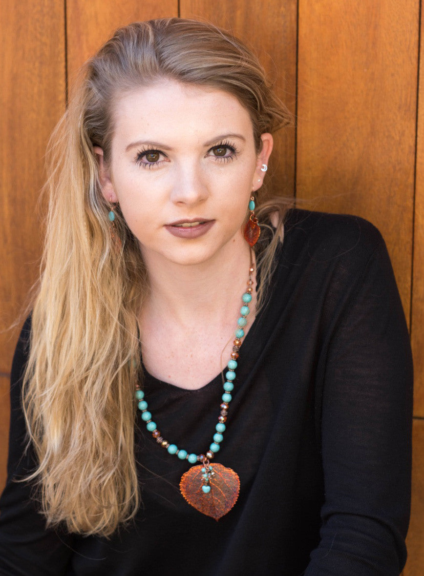Large Copper leaf &Turquoise necklace finished with crystals & turquoise dangles.